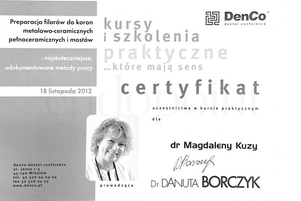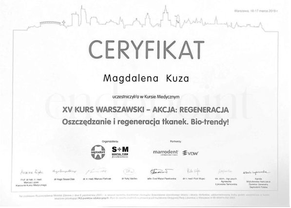 Hiszpania, Francja, Włochy, Finlandia , Stany Zjednoczone, a także wielu innych krajach Europy. Jej szerokie wykształcenie i globalna perspektywa pozwalają jej na bieżąco wdrażać najnowsze technologie i metody leczenia. Jest specjalistką w endodoncji mikroskopowej, zapewniając precyzyjne, skuteczne leczenie, które ratuje zęby nawet w najbardziej skomplikowanych przypadkach. Jako członkini Europejskiego Stowarzyszenia Endodontycznego i Polskiego Towarzystwa Endodontycznego stale poszerza swoją wiedzę, dostosowując swoje umiejętności do najnowszych światowych standardów. Jej podejście do pacjenta wyróżnia się dbałością o każdy detal oraz pełnym zrozumieniem indywidualnych potrzeb. Niedawno rozszerzyła swoją praktykę o medycynę estetyczną, specjalizując się w zabiegach z użyciem toksyny botulinowej, co pozwala jej oferować pacjentom kompleksowe podejście nie tylko do zdrowia zębów, ale i estetyki. Dzięki temu każdy pacjent może liczyć na holistyczną opiekę, obejmującą zarówno funkcję, jak i wygląd. Prywatnie lek. stom. Magdalena Kuza jest miłośniczką podróży, które inspirują ją do nieustannego rozwoju. Jej zaangażowanie, perfekcjonizm i nieustanna chęć doskonalenia sprawiają, że jest nie tylko ekspertem w swojej dziedzinie, ale także lekarzem, któremu pacjenci mogą w pełni zaufać.